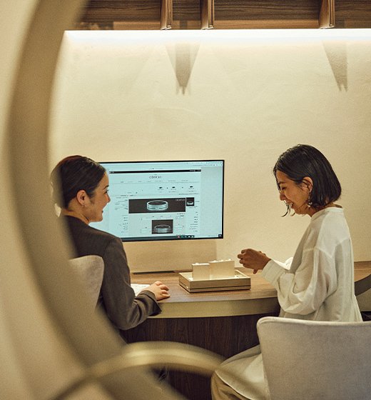 今泉自宅のパソコンからリングデザインシステムを試してみたときは、すっきり系のベースを選んで少し幅を変えて、それで完成かなと思っていました。でもリングアドバイザーの方と一緒にサンプルを見ながらやってみたら、さらにイメージが広がって。イエローゴールドとコンビにすれば、ほかのアクセサリーをつけるときに、シルバーとゴールドの両方を合わせやすくなるなんてことも気づかされましたし。幅をほんの少し広げるとか、色の違う金属を組み合わせるとか、質感をマットにしたりとか……、たくさん選択肢がありすぎて決められない(笑)。自分のリングデザインを変更すると、それに合わせて相手の指輪のデザインを自動的にペアっぽくしてくれるのも面白かった。こだわりが強いほうが先に作って、あとで調整していくのがいいかもしれません。