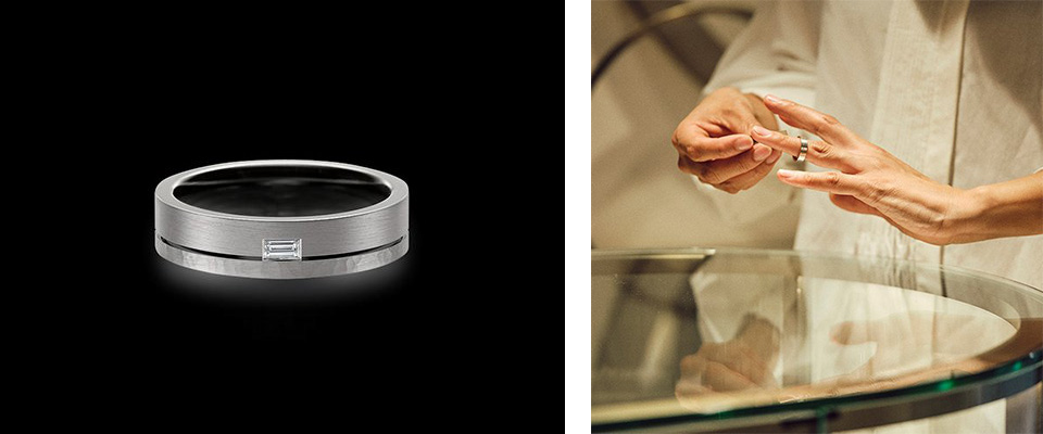 今泉私は可愛らしいものが苦手で、結婚指輪としてよく見かける華奢でフェミニンなものよりも、メンズライクなすっきりしたデザインにしたくて。少しごつい感じもいいなと思って、幅を3mmから6mmに変えて幅を太くしてみました。きらきらした石もそんなに興味がなかったけれど、四角い小さなダイヤが横に埋め込まれているのは素敵だなとプラス。仕事中に手をよく使うので、ダイヤモンドが落ちてしまったらという不安はあります。でも、「石が取れてしまう原因はリングのゆがみがほとんどで、アクレードは硬度の高い鍛造製法で作られているから歪みが出にくく、取れる可能性はとても少ない」と聞いて安心しました。大工さんや消防士さんにも選ばれていると聞いて納得です。