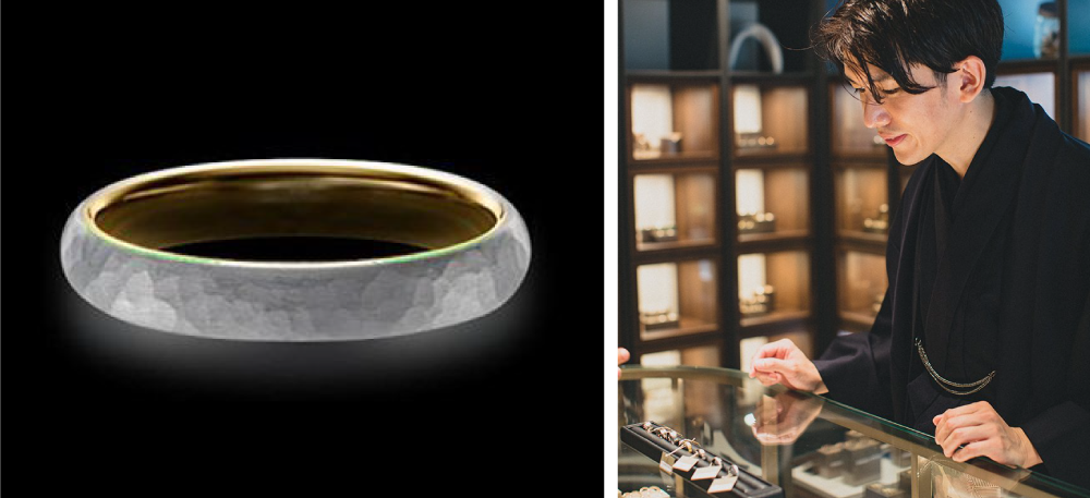 泉二着物も反物を選ぶところからのオーダーメイドなのですが、悩むことはほぼありません。ところが結婚指輪となると、想いがこもるからか決めるのが難しい。テクスチャーや色味、エッジの微妙な違いでイメージががらりと変わるので、選択肢の多さに頭を抱えてしまいました。そんなとき、リングアドバイザーの方にアドバイスいただくと、自分の欲しいものが明確になっていく。「プロの意見って助かるな」と実感しました。リングの外側と内側の色を変えることもできると聞きました。見えないところにこだわり、という点は、着物の「裏勝り」と言われる羽織の裏地のような感覚で粋だなと思います。