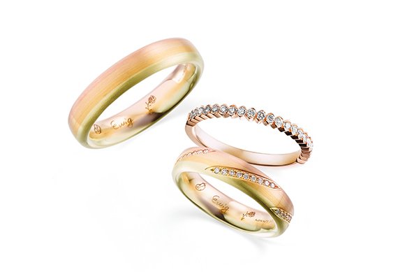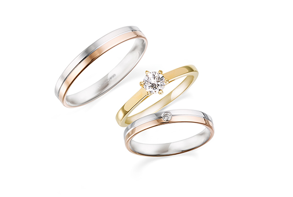 重ね付けで1本のスリーカラーリングのように。 結婚指輪と婚約指輪の一体感が魅力。