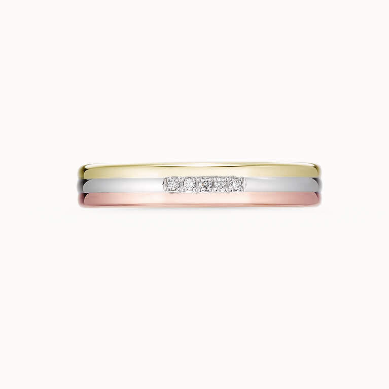 「結婚指輪はスリーカラーが欲しい」、学生の頃からの夢だったというその結婚指輪を求めて、さまざまなジュエラーを訪ねたというお客様。アクレードなら、金額的にも予算内で調整できるのではないかとご相談いただきました。そして思い描いていた理想の形にデザインしたのが、存在感のあるスリーカラーの指輪。3つのゴールドを指元にまとうだけでも華やかですが、センターにはダイヤモンドもプラス。「予算内に収まっただけでなく、品質にも妥協せず、デザインも思い通り!本当に嬉しいです」とご満足いただきました。デザインNo. S-12P9C2-GWR7