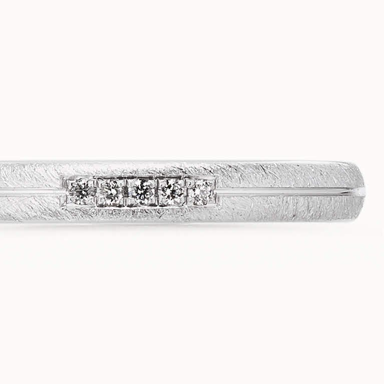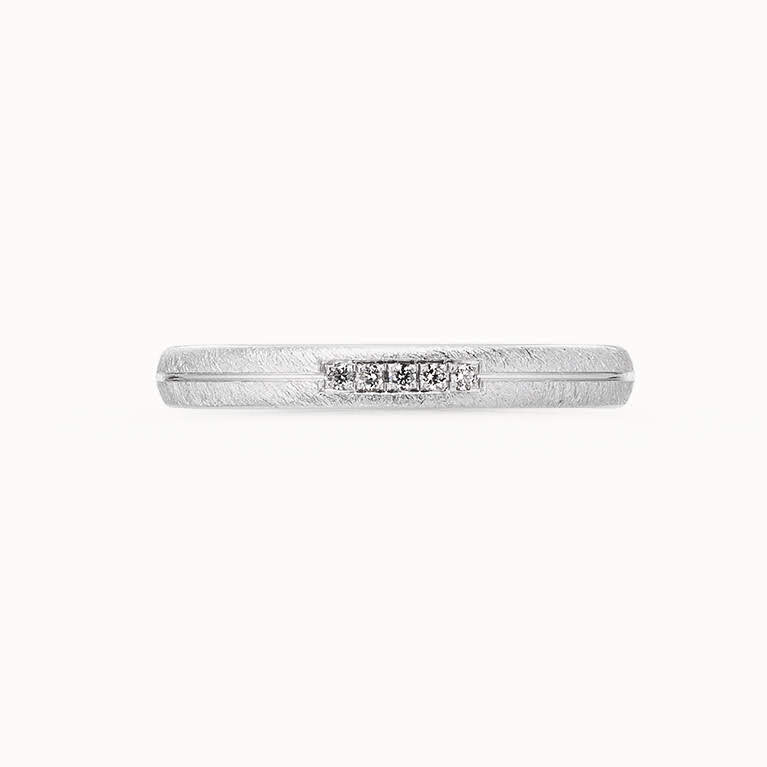 – スノー - アイスマットのテクスチャーが、まるで空から舞う粉雪のように立体的で神秘的。さらに中央にずらりと並んだ5粒のダイヤモンドも美しく輝き、シックなきらめき感に満ちた結婚指輪です。冬の寒い日、雪が降る中でのプロポーズの思い出を、一生指につけていたいとの想いを叶えたお客様。人気の細身のリングで、華やかな個性もあって、さらに金額もおふたり合わせても20万円代に抑えていることから、サンプルをご覧になったほかのお客様からも「こんな指輪が欲しかった」とのお声も多い指輪です。デザインNo. A-12MS2A-WW7