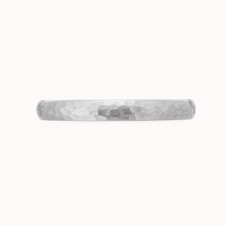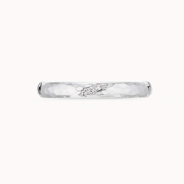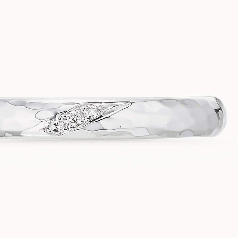 – アクア - アウトドアが共通の趣味だというおふたり。週末には車で湖などに出かけて、自然の中でリフレッシュしているそうです。そんなおふたりとお話しするうちに「自然のものを結婚指輪のモチーフにしたい」とデザインの方向性が見えてきました。アーム部分は、鏡面のハンマーマット仕上げで湖面のきらめきを、ダイヤモンドは湖面に反射した太陽のように輝きます。もう一方の指輪はマットなハンマーマット仕上げに。普段からクラフト系のリングがお好きだとのことで、違和感なくつけられると喜んでいただけました。「結婚後も一緒にアウトドアを楽しもう」との約束も込めた指輪です。デザインNo. A-10NCEV-W7
