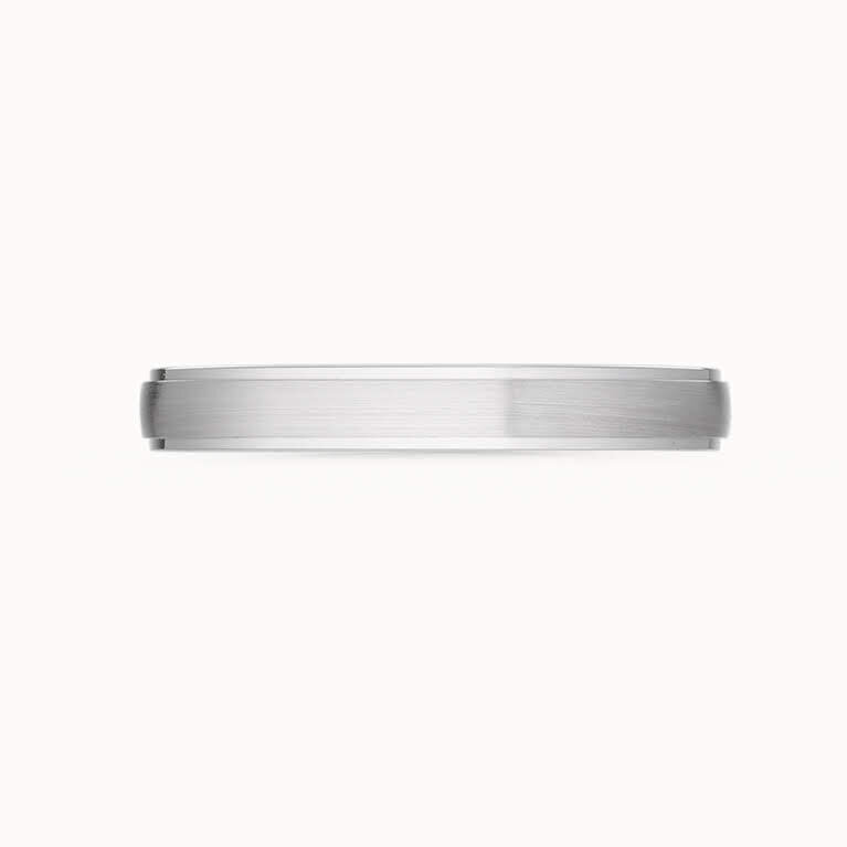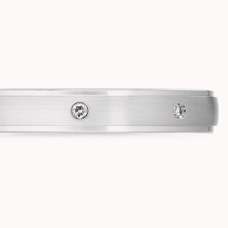 – プラネット – 「ダイヤモンドの結婚指輪を日常的につけていたいけれど、仕事は手作業が多くて石がぶつからないか心配」とお客様。そこでダイヤモンドは、アームに埋め込むタイプをアドバイスし、引っかかりがないようにセッティング。おふたりで試行錯誤しつつ、ひと粒だけではなく一定間隔で1周留めることで独創性のあるデザインに仕上げてくださいました。実は、この指輪には、鍛造製法ならではの端正さが秘められています。ひとつは、アームのヘアライン加工の美しさ。これほどまでに水平をきれいに保ち細い筋をいくつも入れられるのは、工作機械による緻密な計算があってこそ。もうひとつは指輪の淵に表れています。1色の地金で両サイドにラインを入れたような加工を施すには、外側を削り落とすのですが、鍛造製法はほぼ直角に削ることができるため、見た目のクオリティにも大きな差が生まれます。デザインNo. A-10WLU8-WWW7