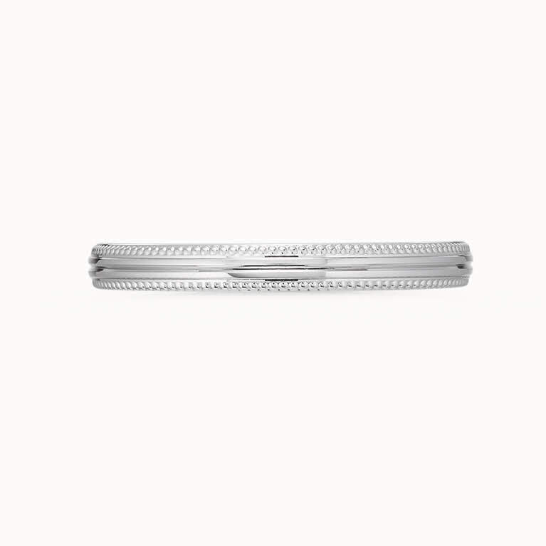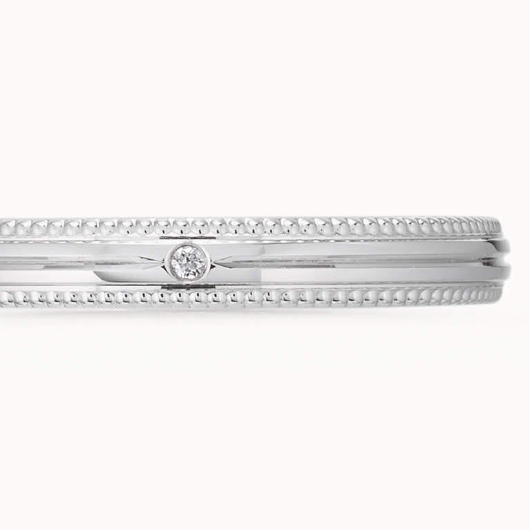 – ツイニング - アクレードにご来店いただく前に、指輪の好みや方向性についてよく話し合ってきたというおふたり。「生涯つけるものだから、飽きないシンプルなデザインのものがいい」と意見が揃ったそうで、デザインを決めていくプロセスでも迷いなく進みました。そして、上下に2本のミル打ちを施したシンプルで美しい指輪が完成…の直前、「自分たちらしく、さりげないデザインをどこかに入れたい」とお客様。真ん中にラインを1本あしらうことで、シンプルさはキープしつつもほどよいアクセントが加わりました。アクレードのリングデザインシステムは、どの段階からでもデザインを変更することが可能。「完成間近になっても、デザインを変えられるとは思わなかったので嬉しいです」とお喜びいただきました。デザインNo. A-13LUUJ-W7