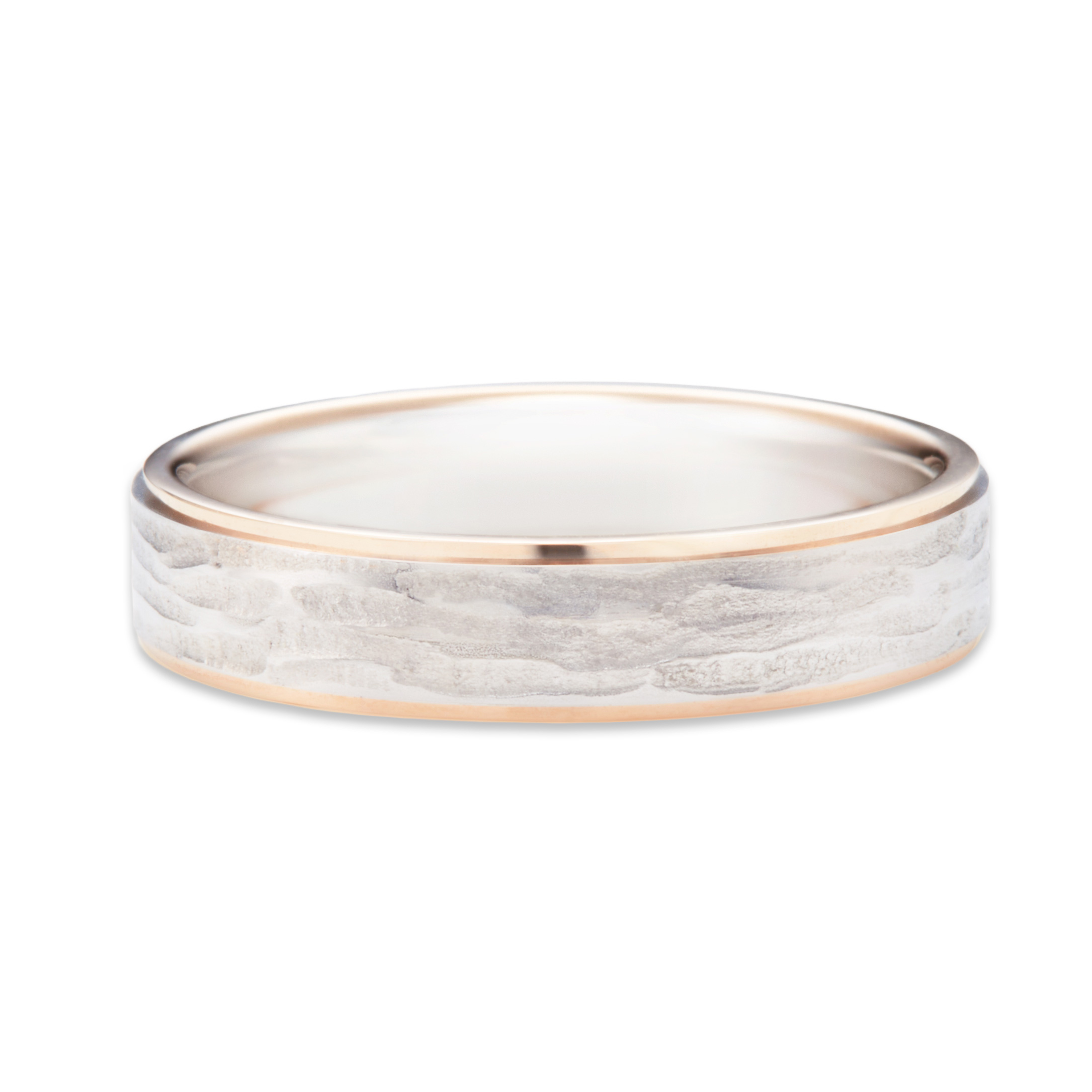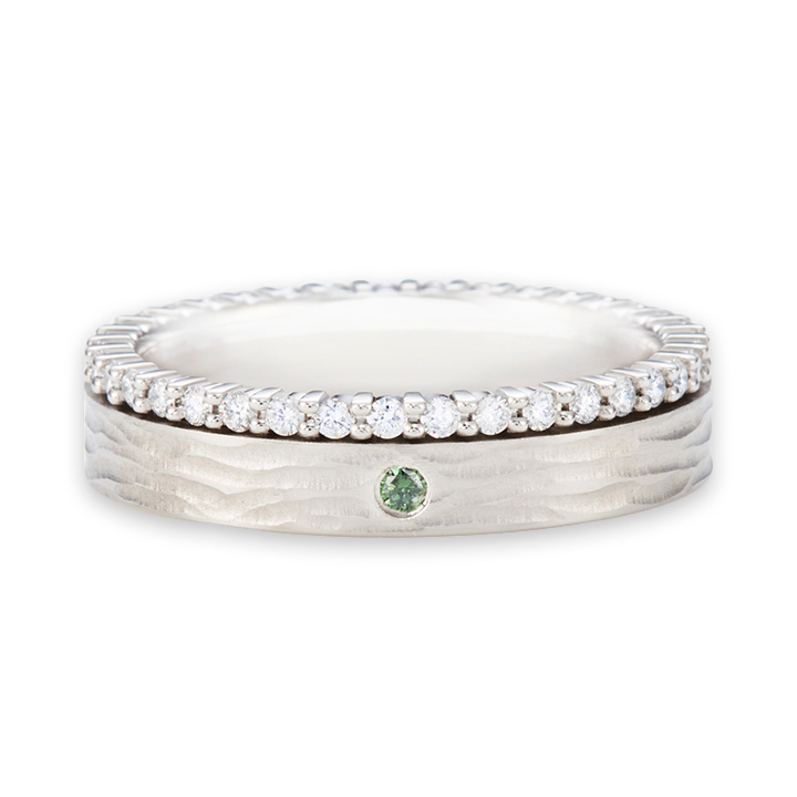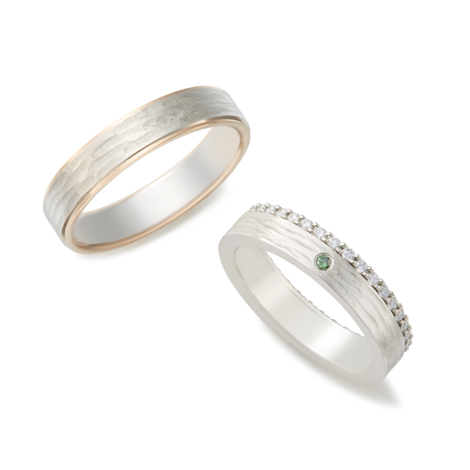 プラチナのリングの表面に樹木の幹をイメージしたネイチャー仕上げを施しました。フォレストグリーンのダイヤを1石あしらったリングの縁にはメレダイヤを半周敷き詰め、ティアラのようなデザインに。もう片方のリングに施したシグネチャーゴールドがアクセント。