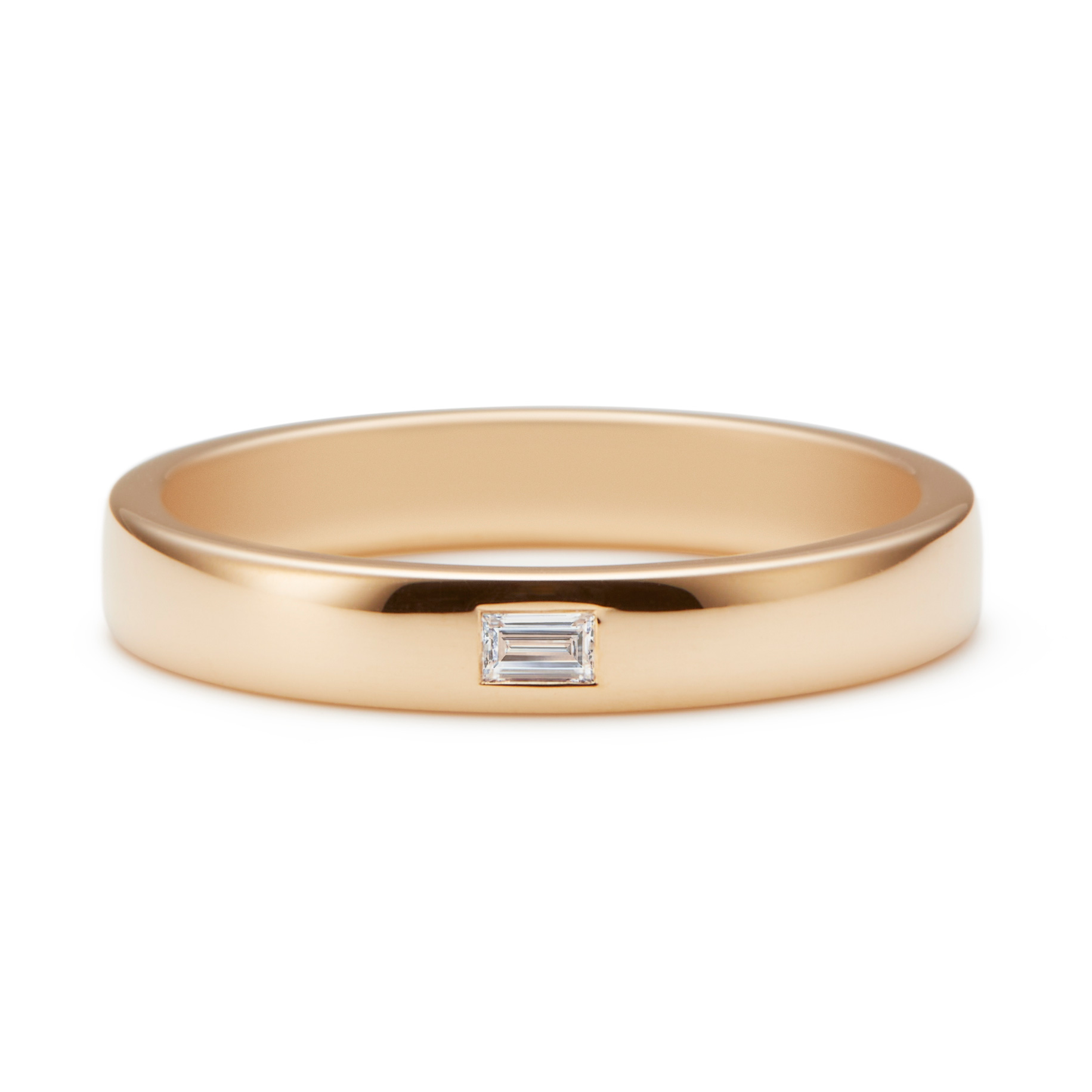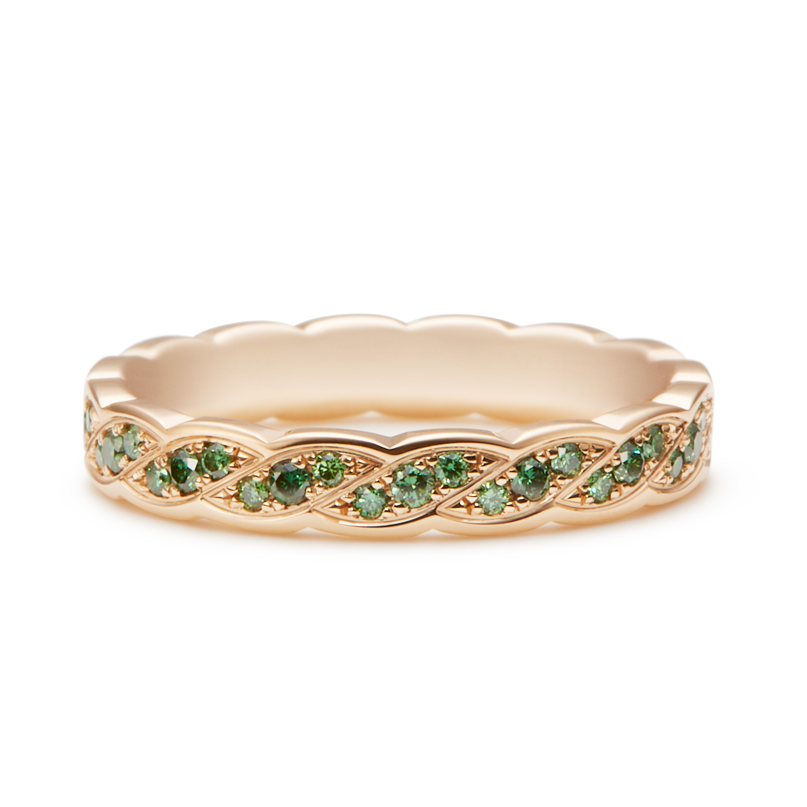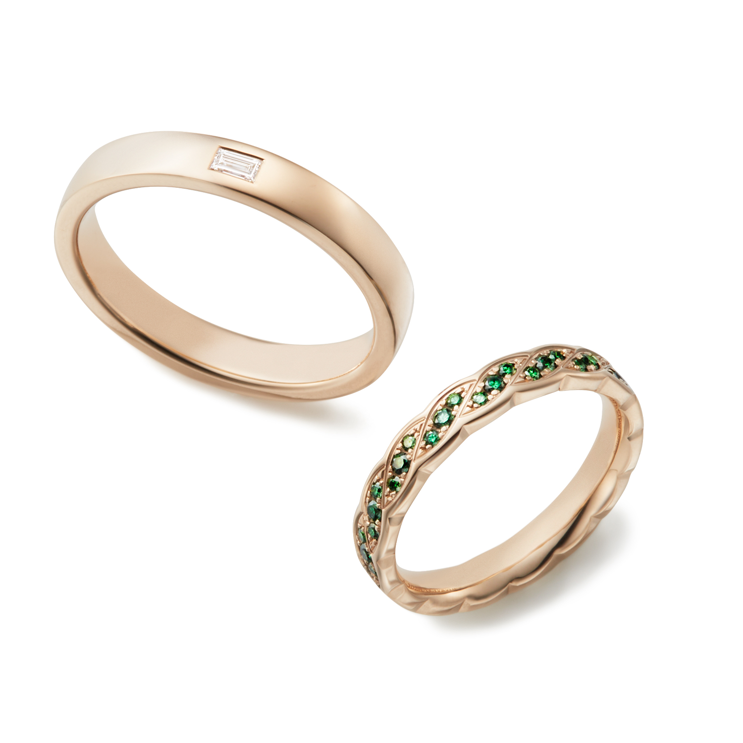 青々とした樹木の葉をイメージしたエタニティリング。葉が一枚一枚連なっているようなデザインが特徴的です。片方のリングにはバゲットカットのダイヤを1石セットした上品なデザインに。