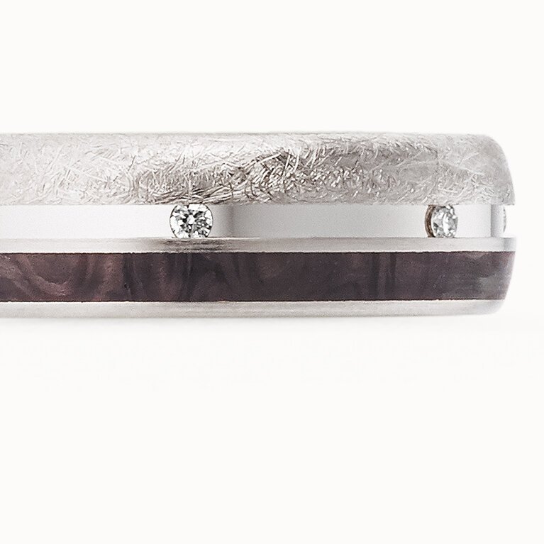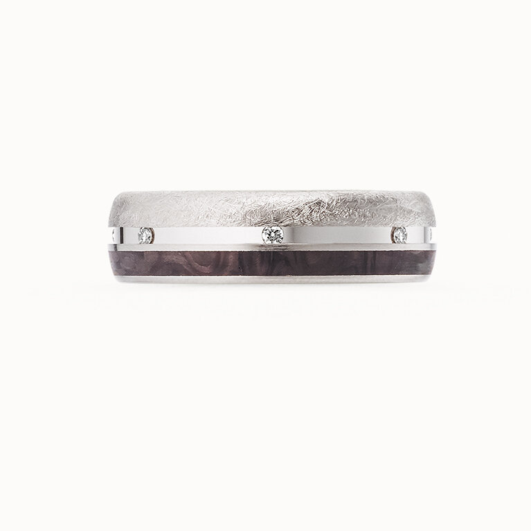 – アイス シュピーゲル - ご来店いただいたのは、日頃から、靴やスーツなど海外のオーダーメイドで仕立てたものを愛用し、身につけているお客様。さまざまな経験から培われた確かな審美眼から、細部にこだわりデザインされました。ベースは、丸みのある指輪のフォルムを選択。光沢感のあるアイスマットのテクスチャーとカーボンのブラックの組み合わせが、ラグジュアリーなオーラを発揮しています。おふたりの落ち着いた大人の雰囲気とぴったりと重なり合う結婚指輪に。デザインNo. S-12D165-DDDDD7