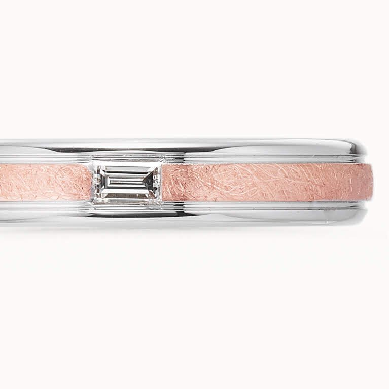 – レール ストーリー - 休日にはよく列車旅に出るというおふたり。共通の趣味をモチーフにしたオリジナリティあふれる結婚指輪が出来上がりました。上下のホワイトゴールドは、レールをイメージ。アイスマット加工のレッドゴールドのアームもまるで時を重ねたレールのような雰囲気がある色合い。これまでに撮った列車旅の写真を見ながら、終始楽しそうにデザインしているおふたりがとても素敵でした。そんなおふたりがこの指輪につけたタイトルは「Rail Way」。いつまでも笑顔の線路が続きますように。デザインNo. S-12Q6Y7-WRW7